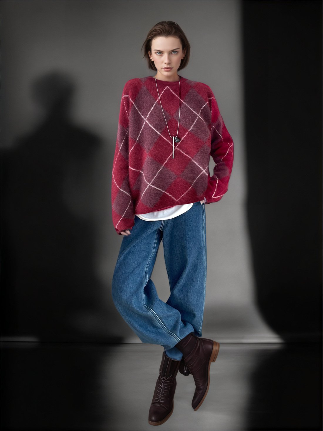 Women’s Wool Cashmere Argyle Knit Sweater | Loose Fit British Style Pullover for Fall Winter