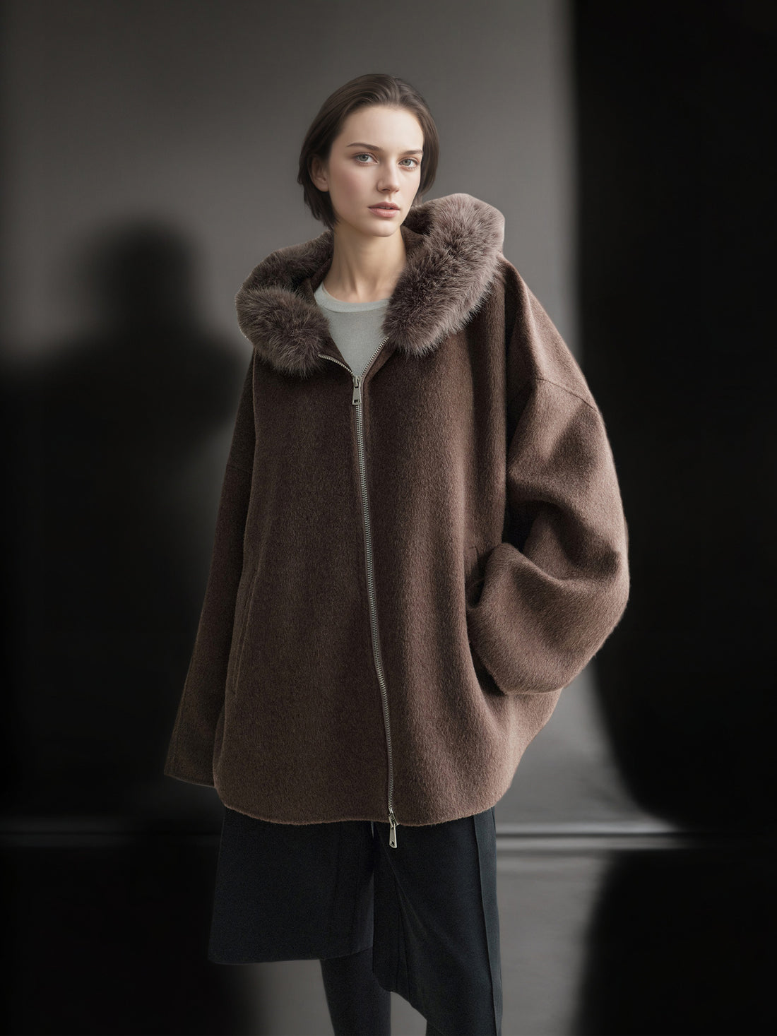 Wool Camel Hair Silk Detachable Fur Hood Cape - Women's Double-Faced Wool Coat