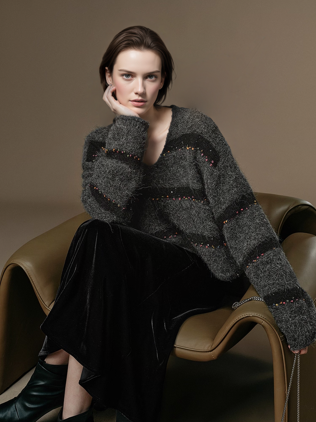 Soft Wool V-Neck Striped Sweater with Colorful Pom Details and Subtle Sequins | Relaxed Winter Knitwear
