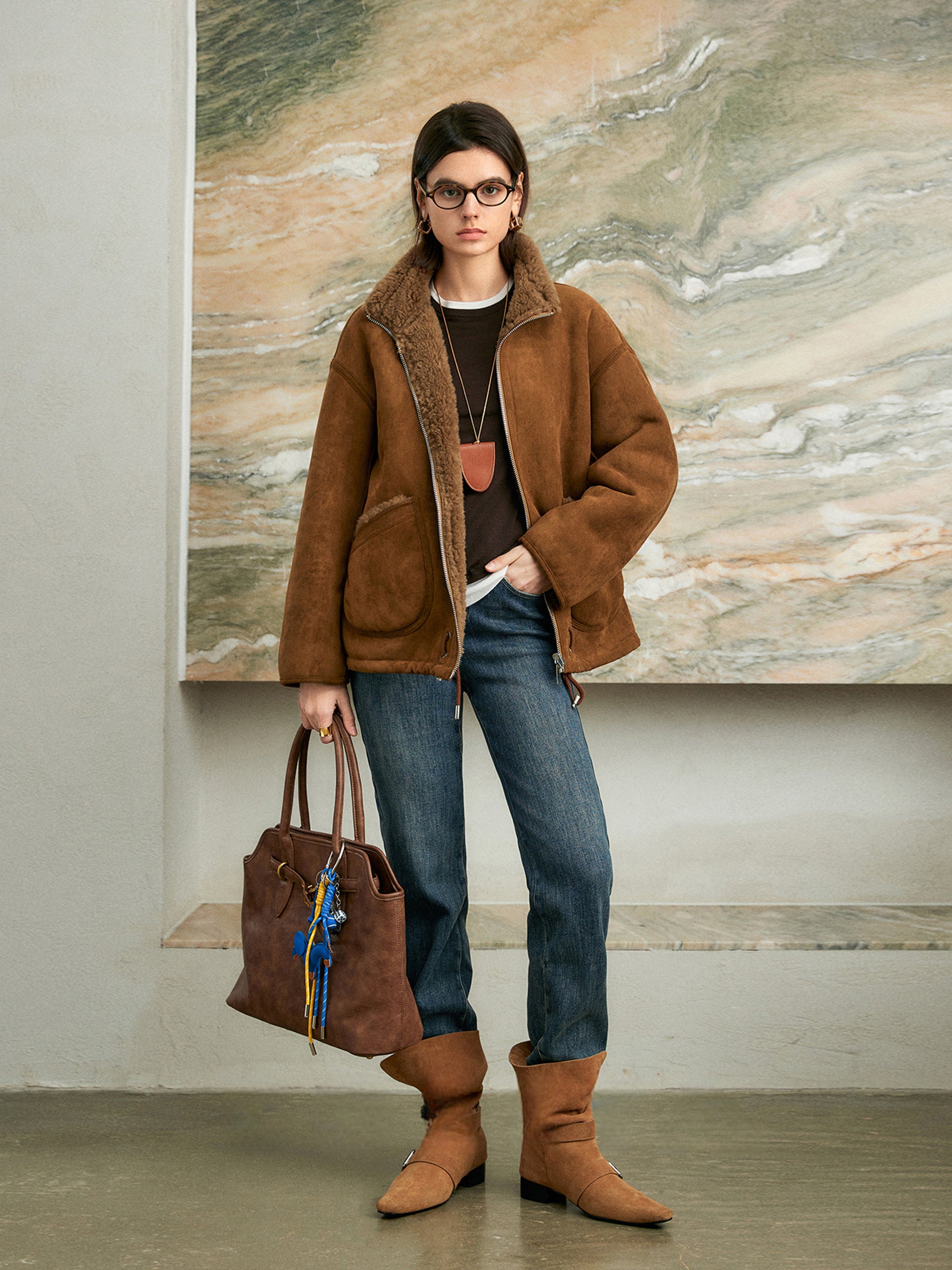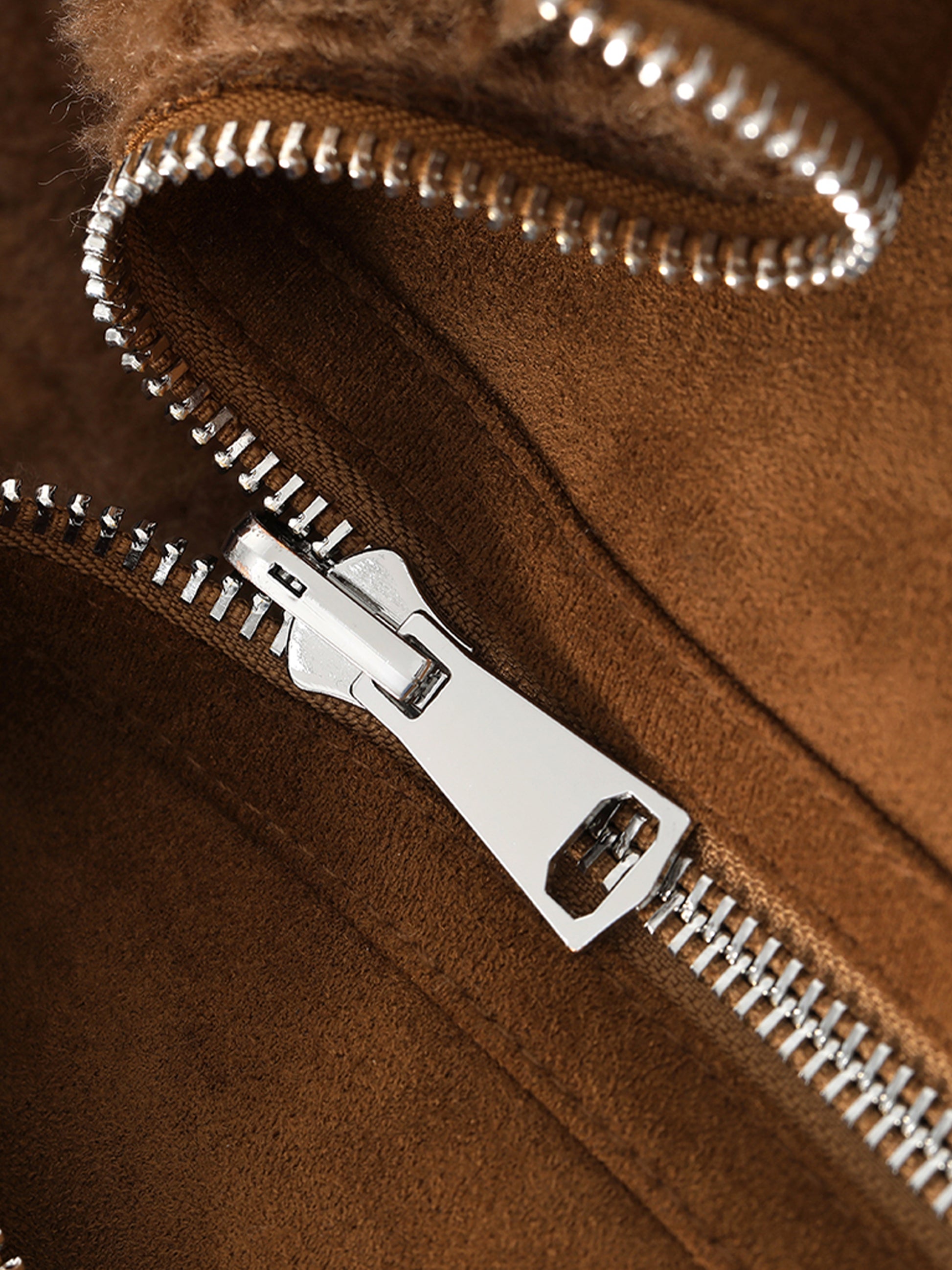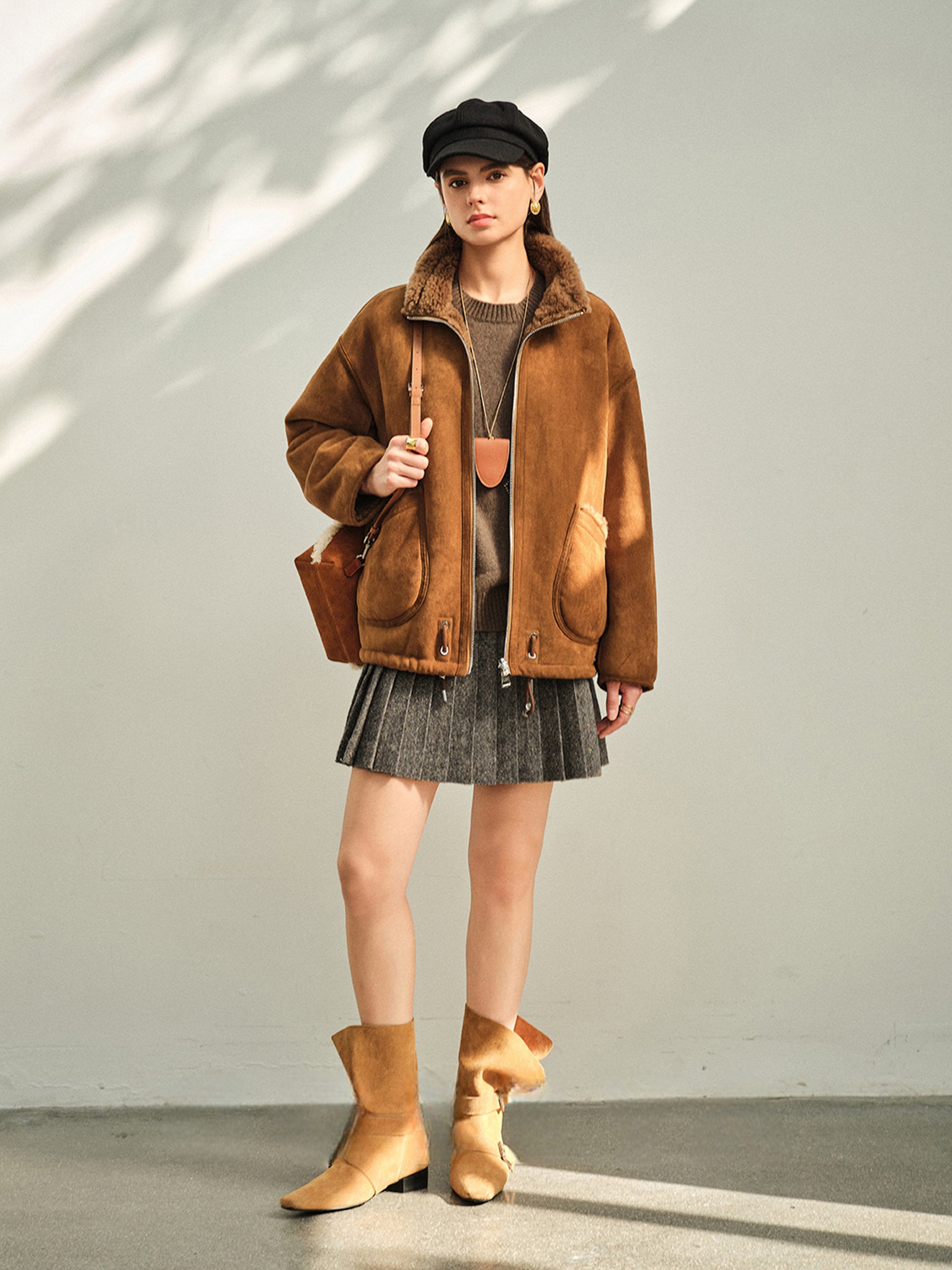 100% Wool-Lined Vintage Brown Faux Suede Jacket – Thick Reversible Shearling-Style Coat for Women