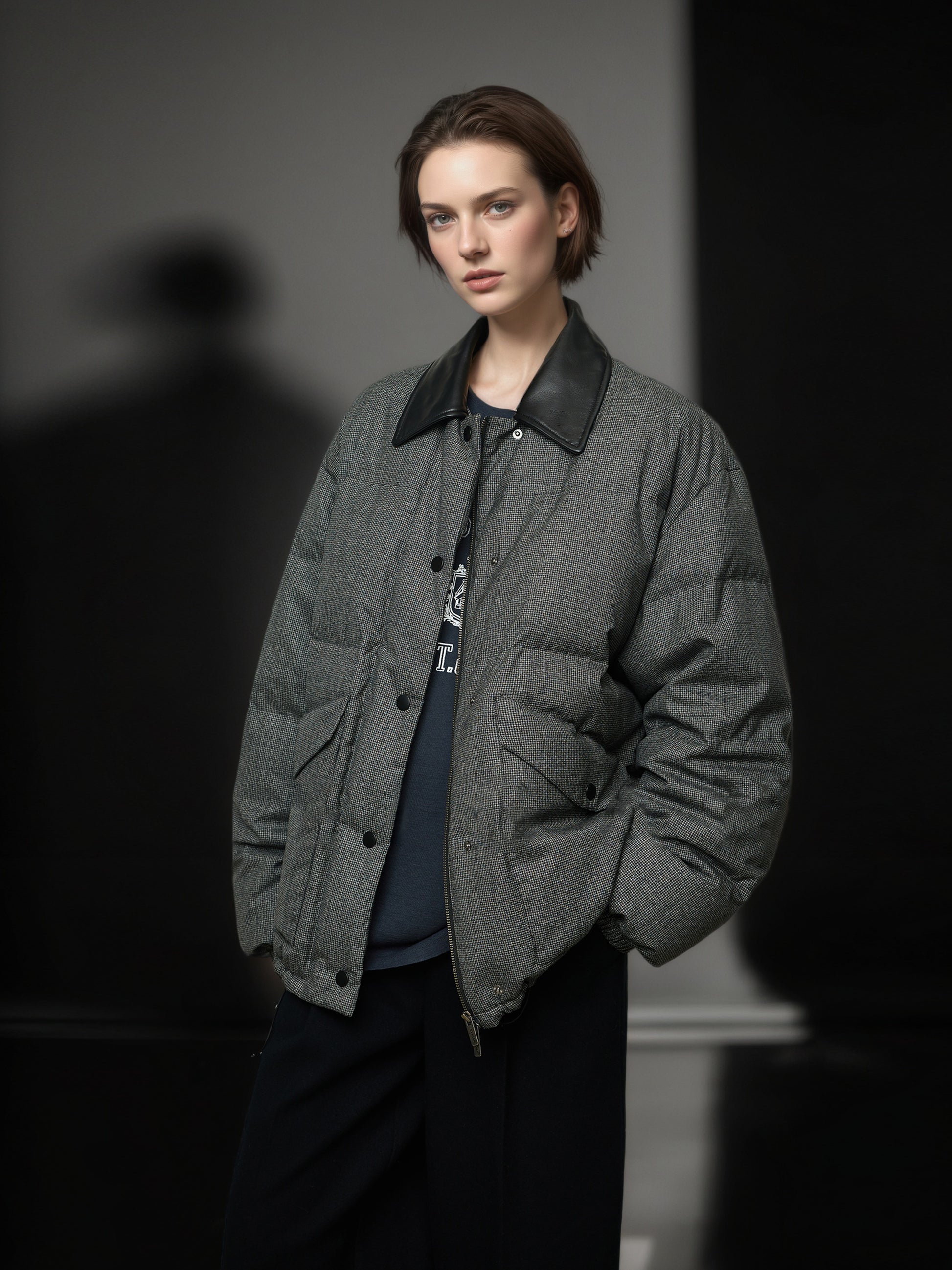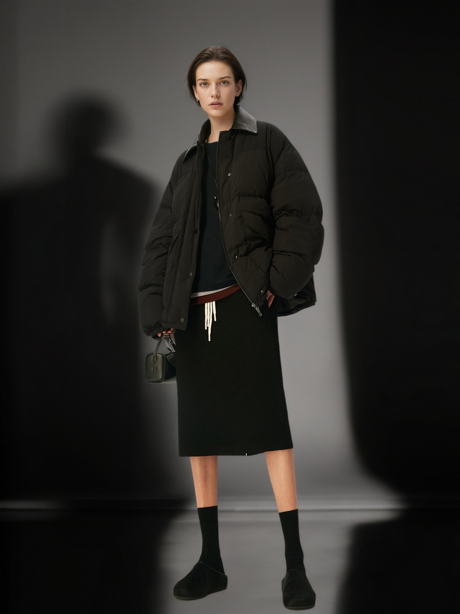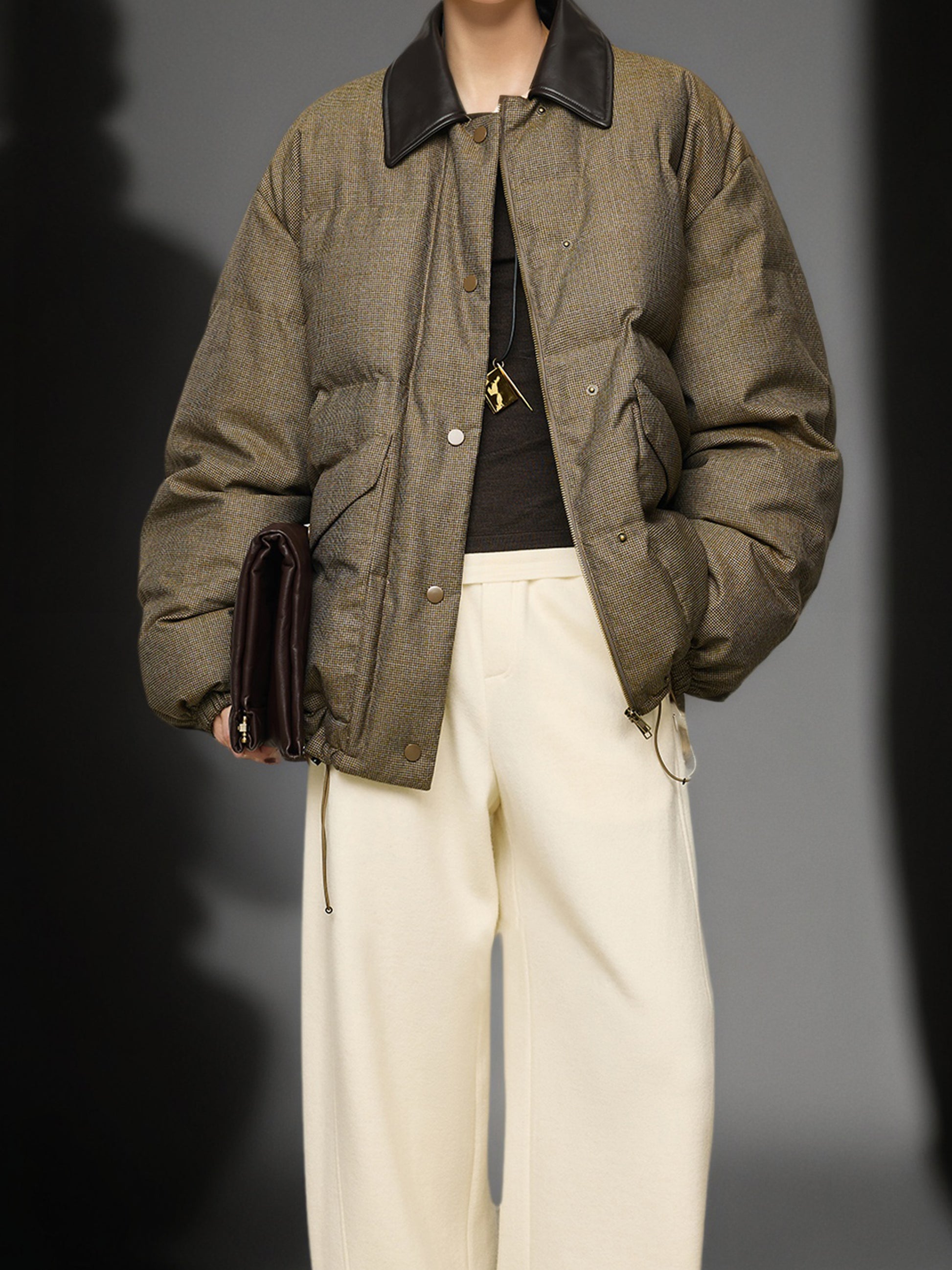 95% White Goose Down Lightweight Puffer Jacket for Women with Leather-Trim Collar and Relaxed MIU-Inspired Design