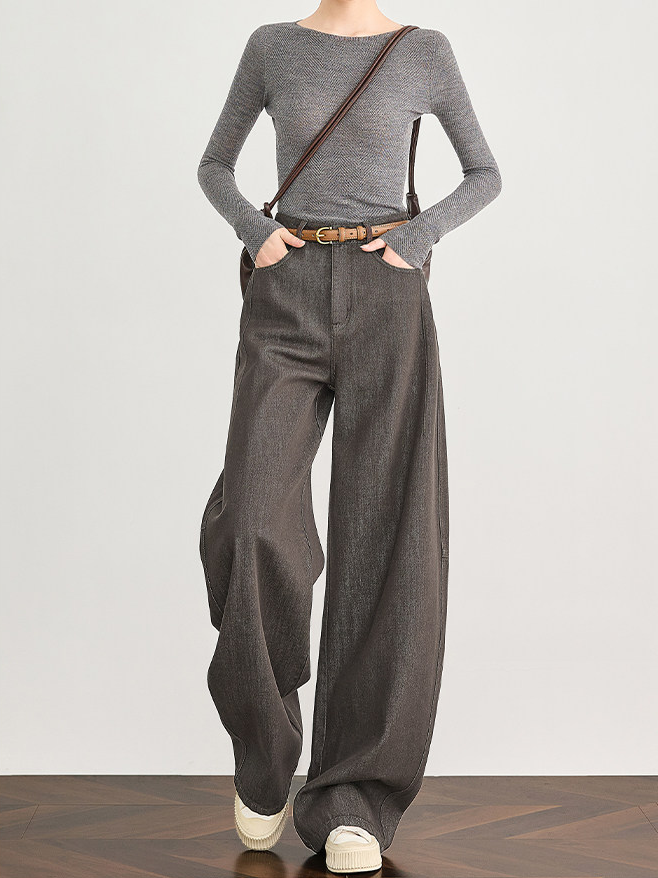 Amber Flow Tencel Brown Curved-Leg Wide-Leg Denim Pants for Women – Thickened Sickle-Cut Jeans for Fall & Winter