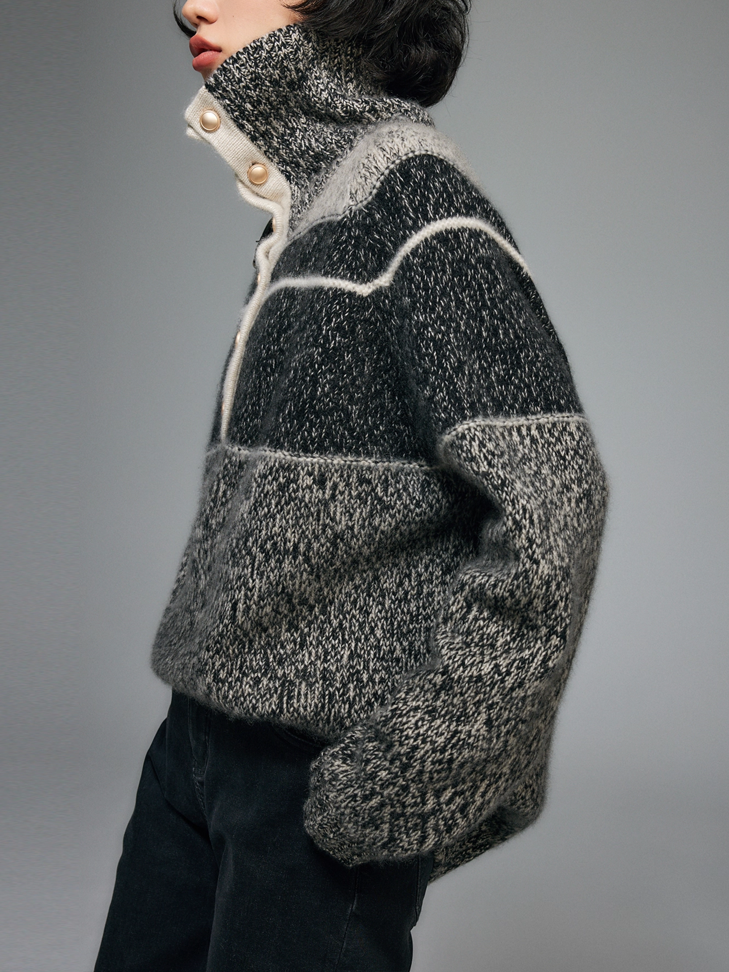 Pure Cashmere French-Style Collar Sweater – Premium Gray Contrast-Color Knit Top