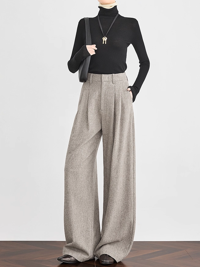 Women's Oatmeal Wide-Leg Wool Trousers – Premium Draped Wool-Blend Suit Pants for Winter