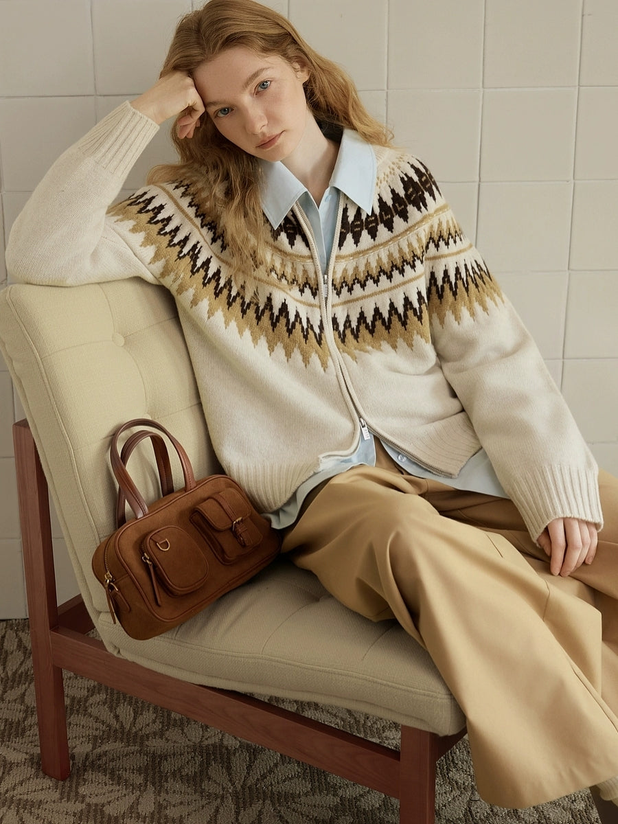 100% Wool Fair Isle Zip-Up Sweater for Women – Winter Knitted Cardigan