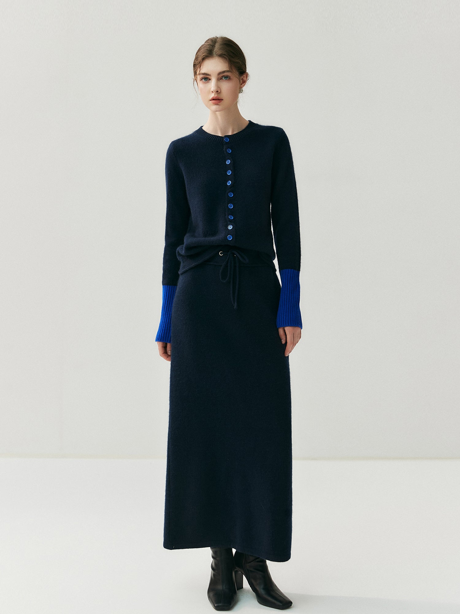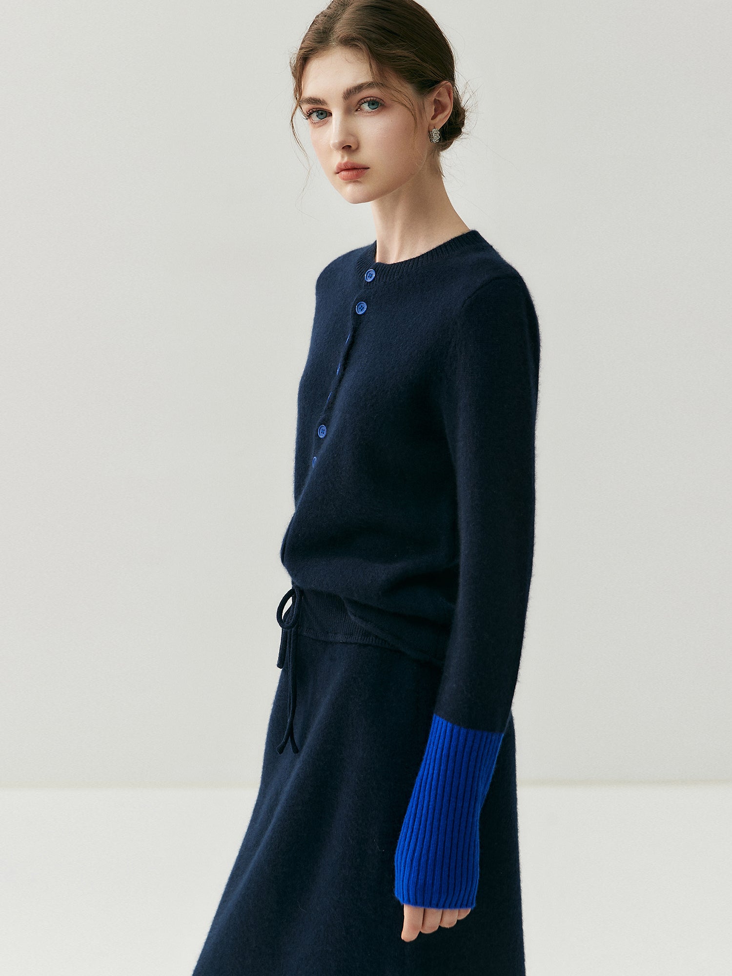Baby Goat Cashmere Knit Cardigan for Women – Crew Neck Color-Block Wool Sweater Jacket