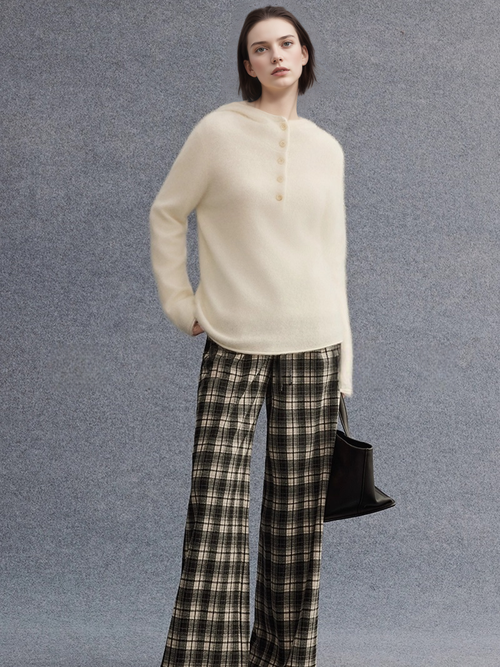 Cashmere Wool Brushed Hoodie Sweater | Henley-Neck Relaxed Fit Soft Cloud-Knit Pullover