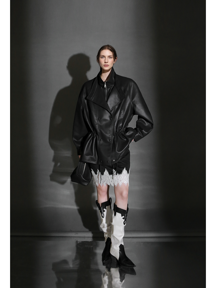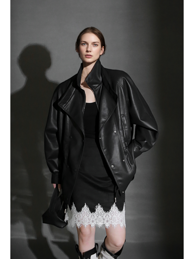 Double-Layer Collar Lambskin Leather Jacket – Chic and Bold Women’s Premium Leather Outerwear, Unique Design