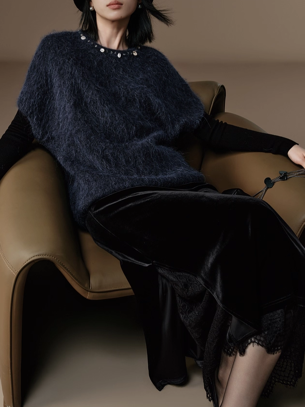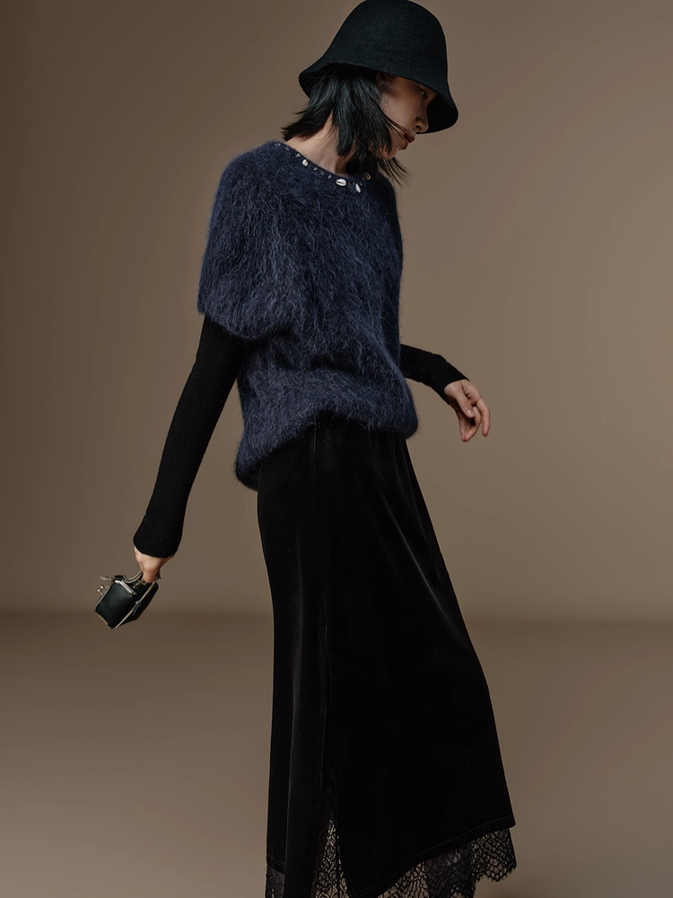 French Romantic Style Stretch Waist Lace-Trim Draped Velvet Long Skirt