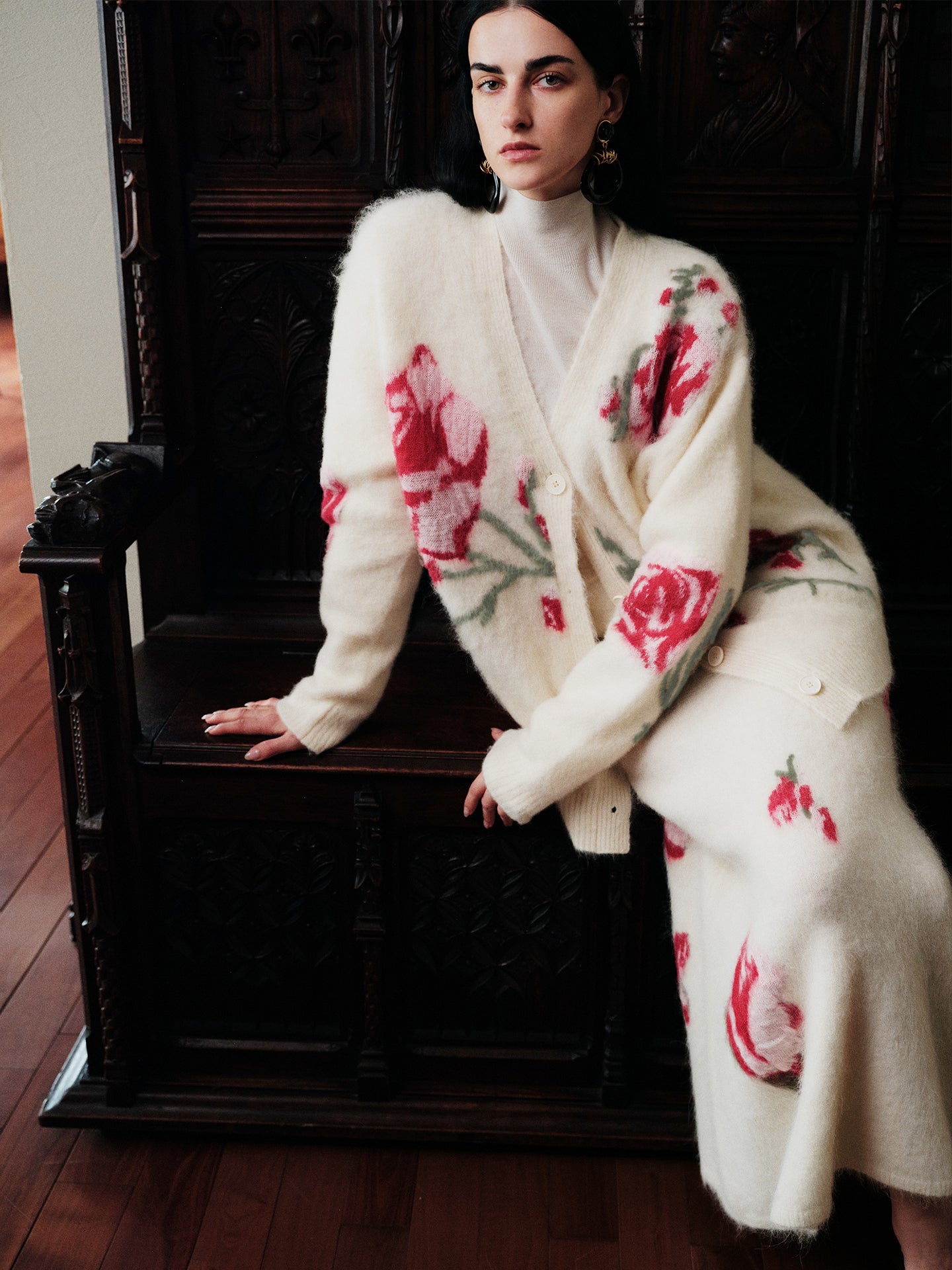 Luxury Alpaca Rose Jacquard Cardigan & Mermaid Skirt – Relaxed Fit (Sold Separately)