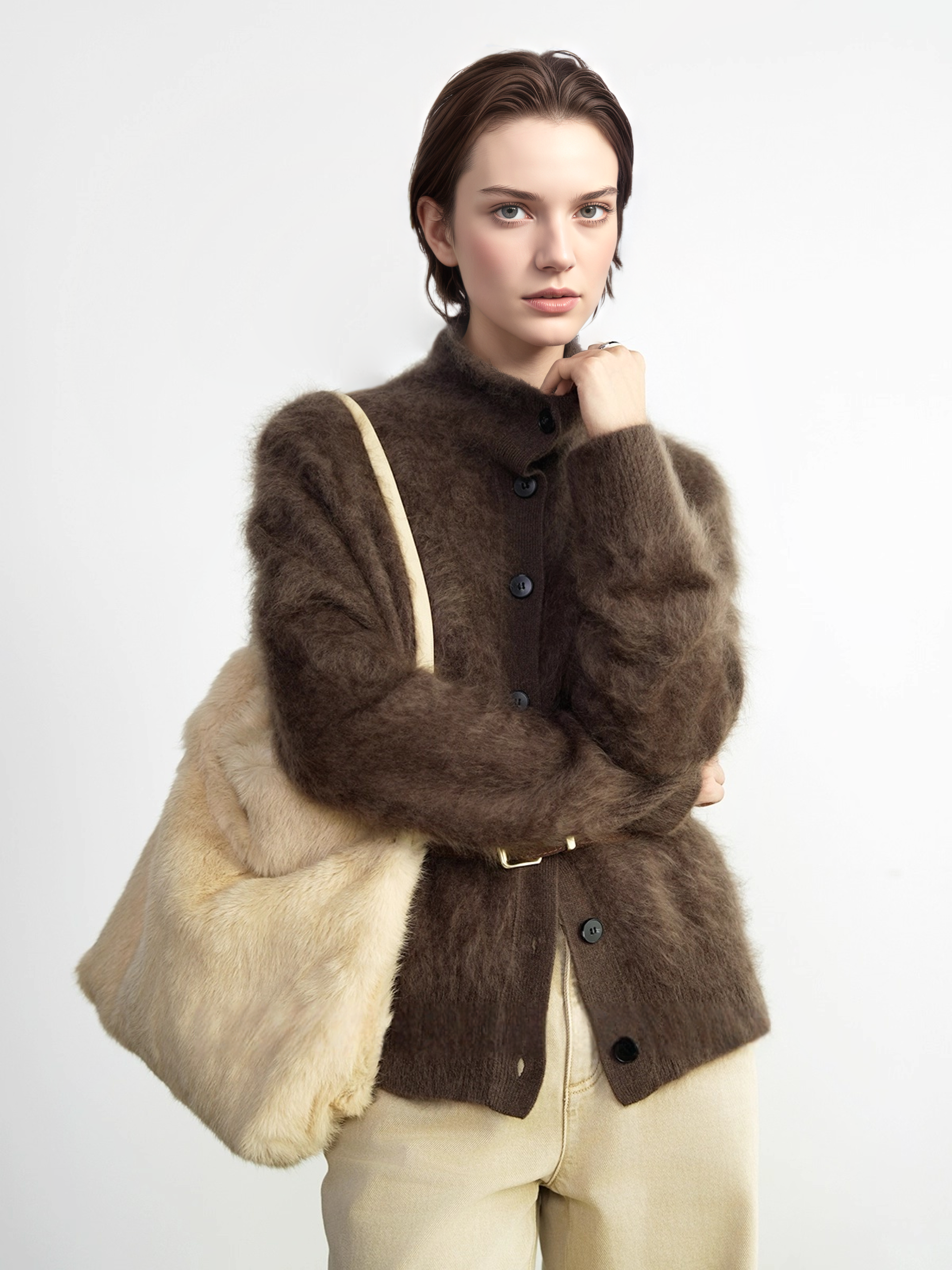 Premium Brushed Cashmere 100% Stand-Collar Button Cardigan for Women