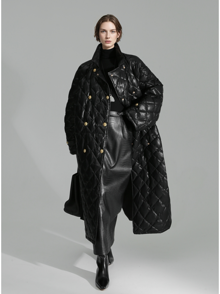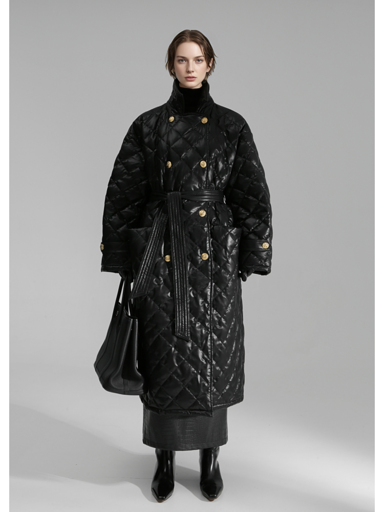 Quilted Lambskin Down Coat for Women – Elegant Mid-Length Slim Fit Jacket with Waist Design, White Duck Down Winter Outerwear