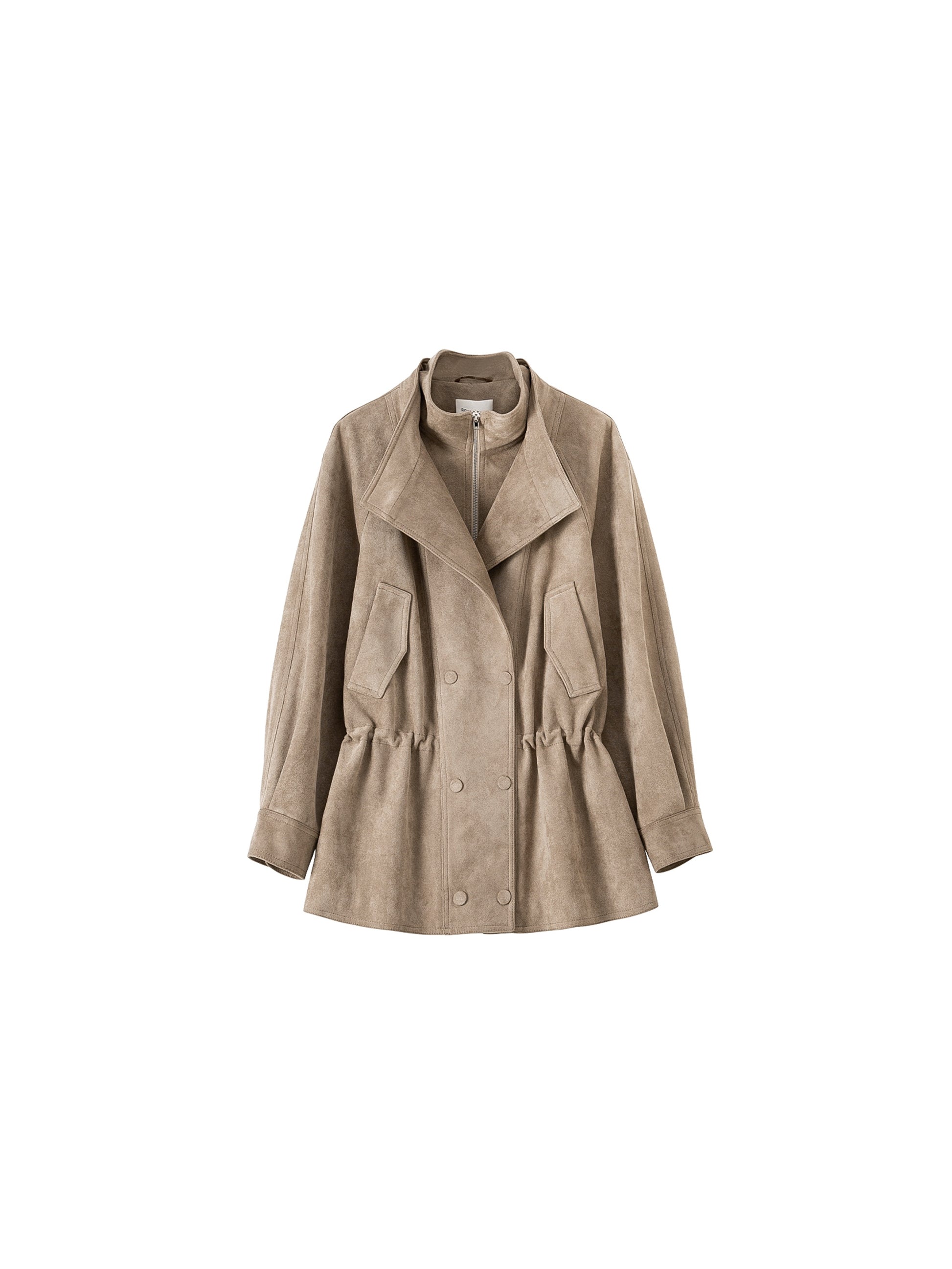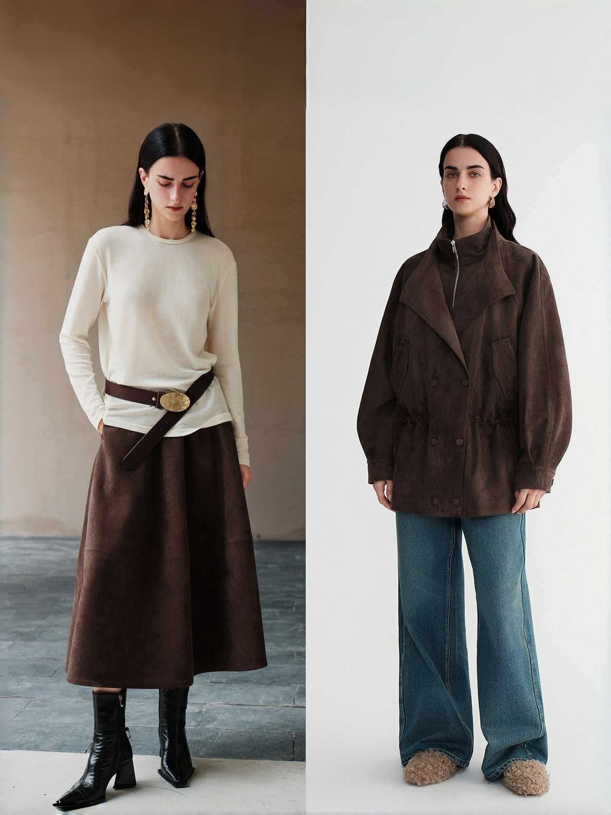 Suede Touch Double-Layer Jacket & Chic Midi Skirt Set – Eco Brushed Fabric