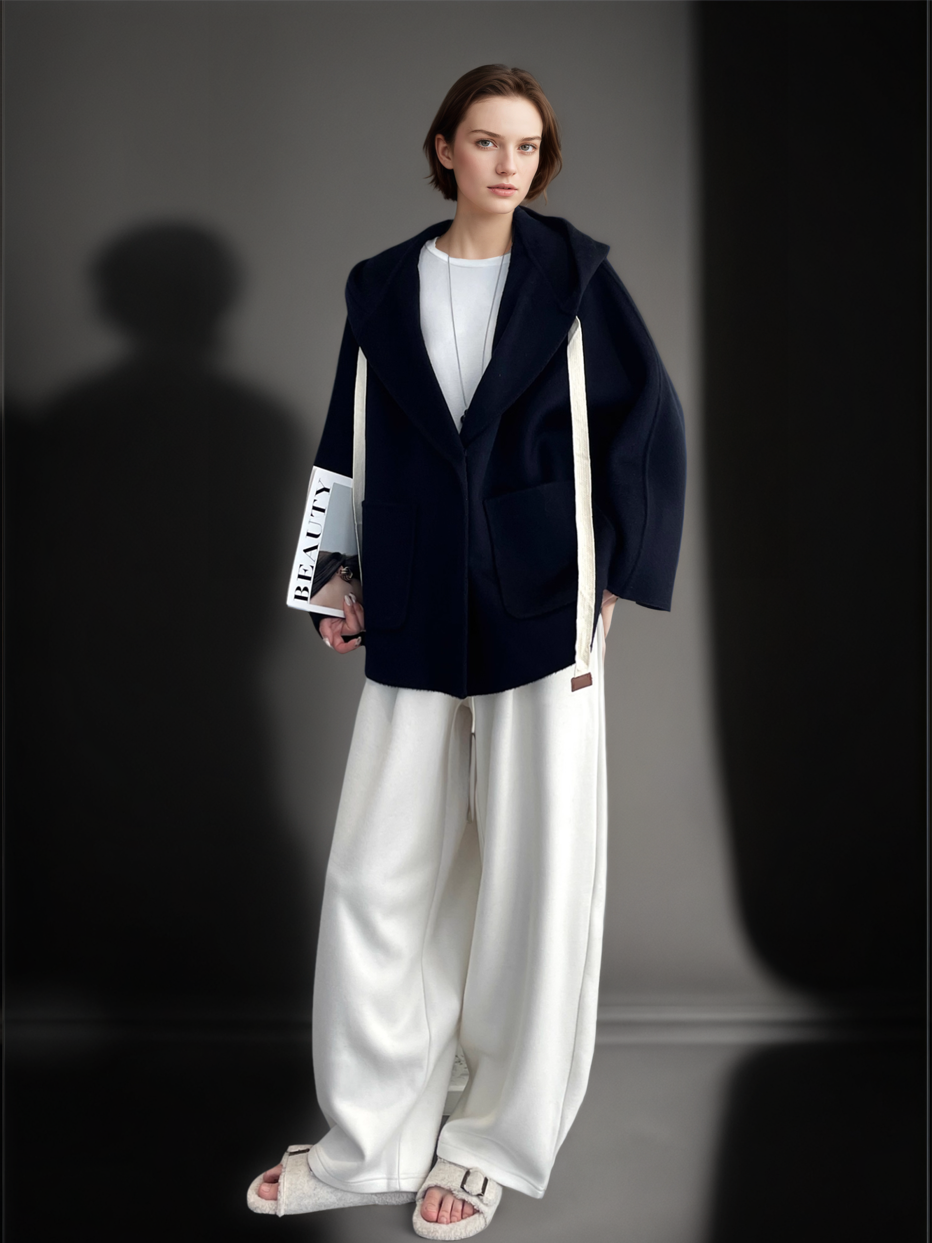 Women’s 100% Wool Hooded Coat | Loose Fit Double-Faced Woolen Cocoon Overcoat