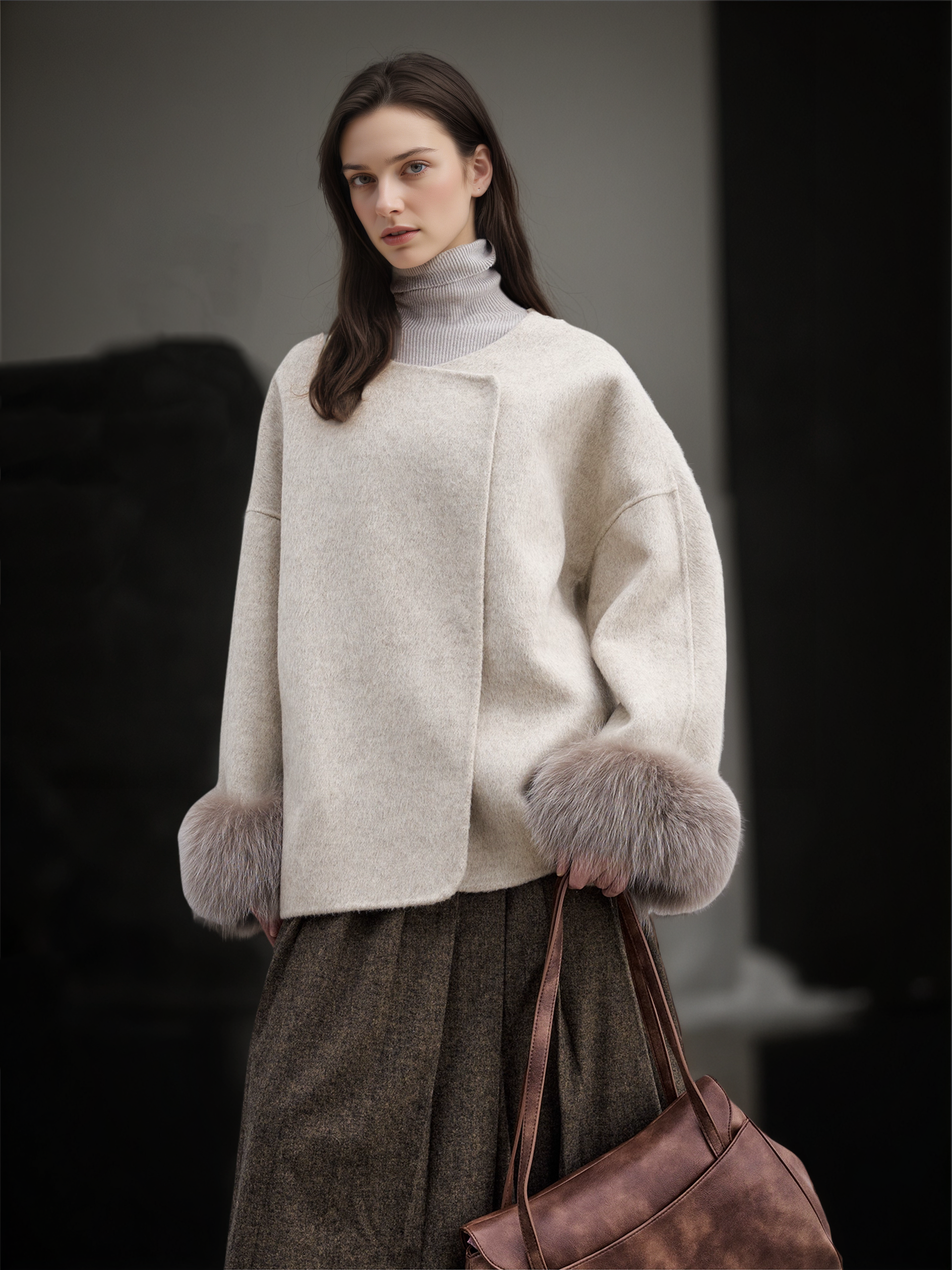 Women’s Short Double-Faced Wool Coat with Fox Fur Cuffs | Loose Fit Alpaca Blend Jacket