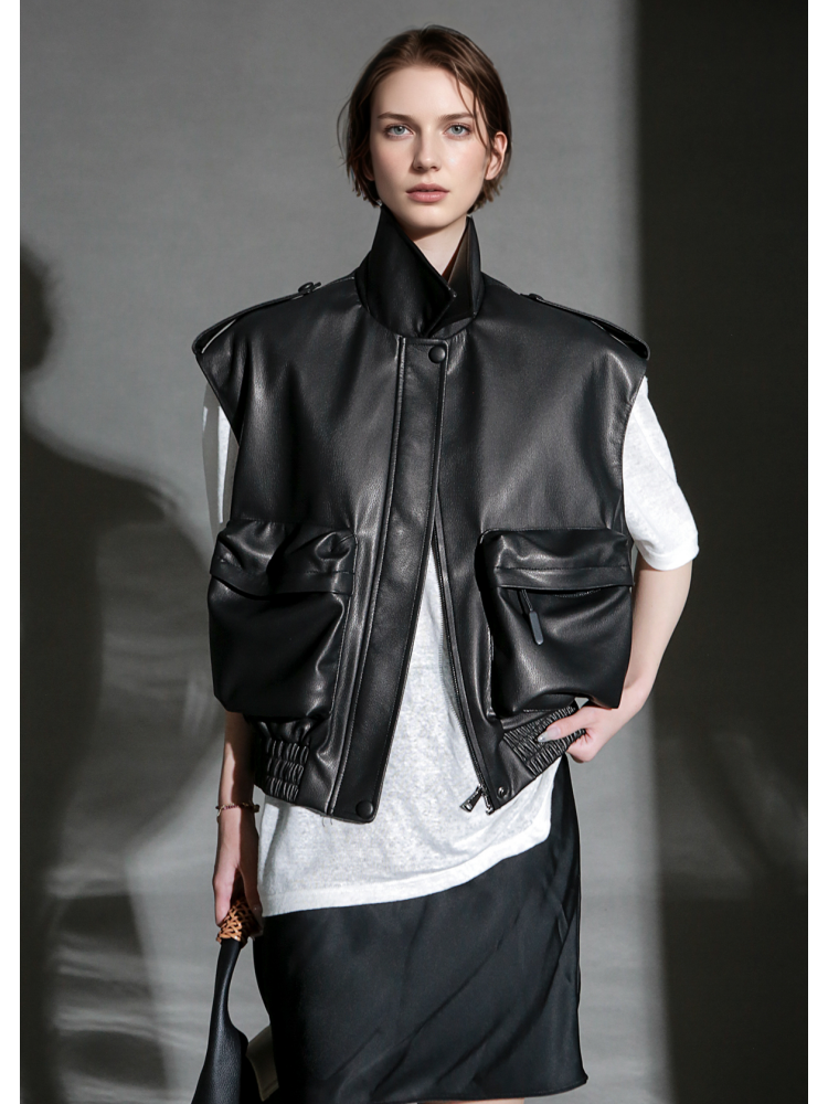 Women’s Short Sheepskin Leather Vest – Bubble Leather Design with Pockets, Notched Collar & Shoulder Strap Details