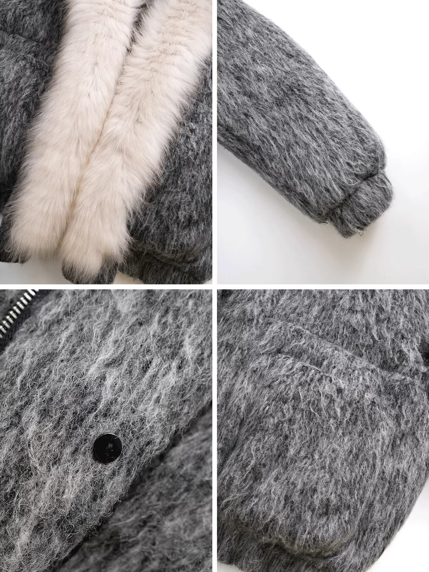 Shell: 9% Alpaca, 42% Wool, 17% Acrylic, 32% Polyester | Fur Collar: Finland Imported Fox Fur | Filling: 90% White Goose Down (86g)