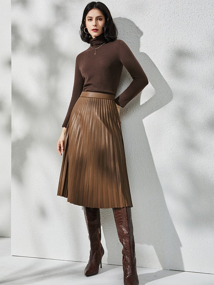 Women's Elegant Vintage High-Waisted Lambskin Leather Pleated Midi Skirt – Luxury Genuine Leather Skirt